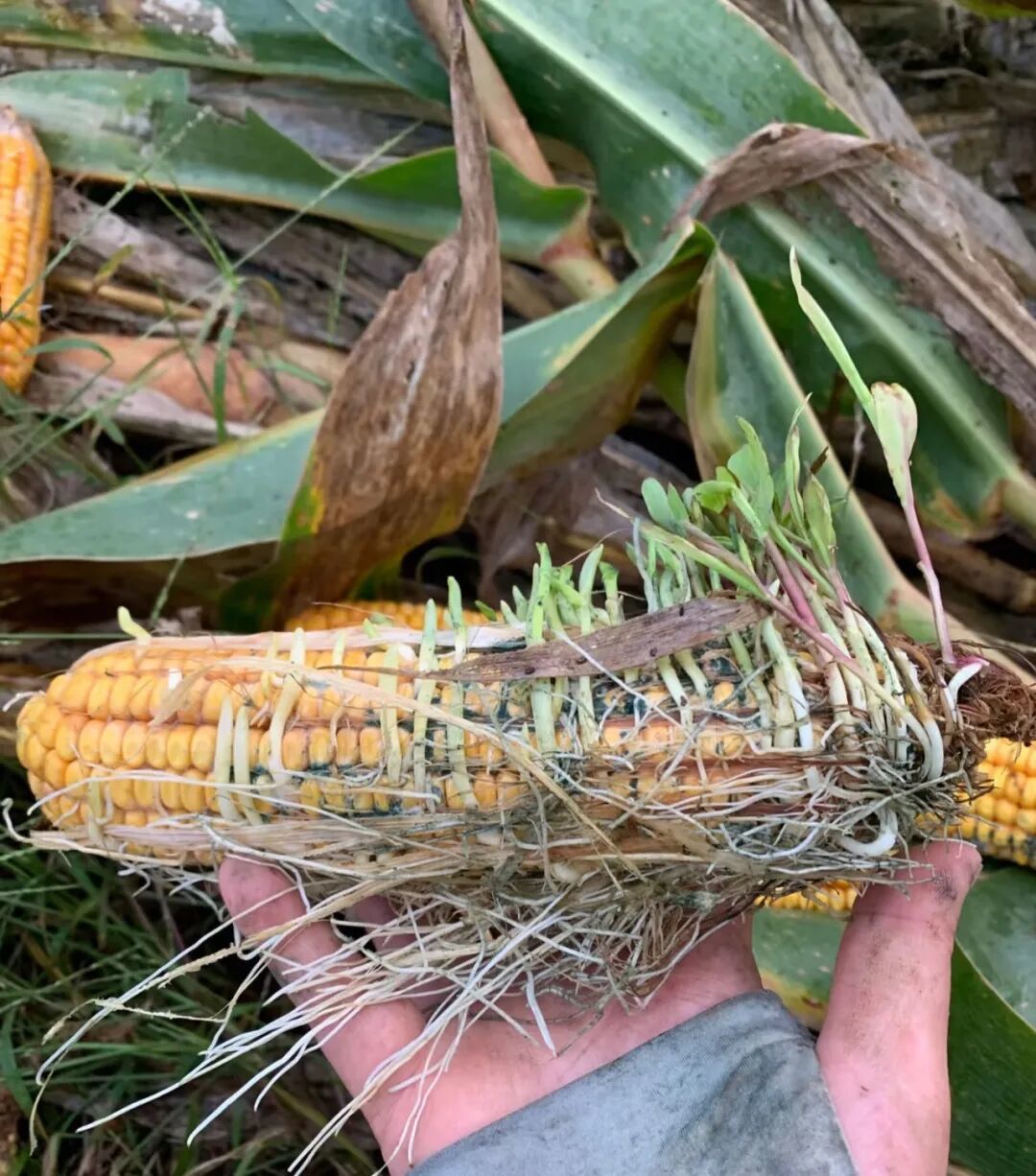 河南是我国重要的粮食主产区之一,周口是河南第一产粮大市。张先生告诉中国新闻周刊,他承包了约90亩地,其中三十多亩种了芝麻,五十多亩是玉米,“20多天前就熟了,但雨一直下,有的穗上发霉了,有的籽粒长出了新芽”。