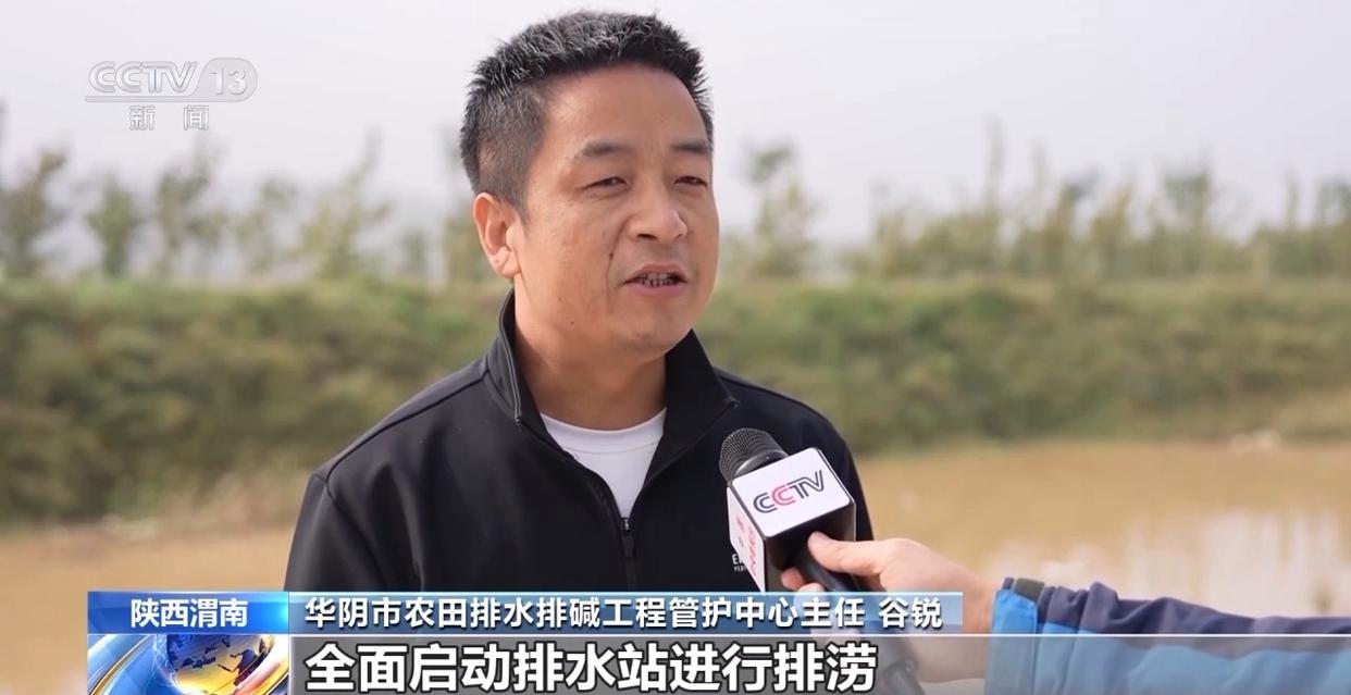 华阴市农田排水排碱工程管护中心主任 谷锐:在这次秋淋期间,我们一方面以水利工程为基础,全面启动排水站进行排涝,在二华干沟沿线建有六座小型排水泵站,从而提升田间的抽排能力和水平,另外在田间搭建临时抽排设施多方位进行抽排。