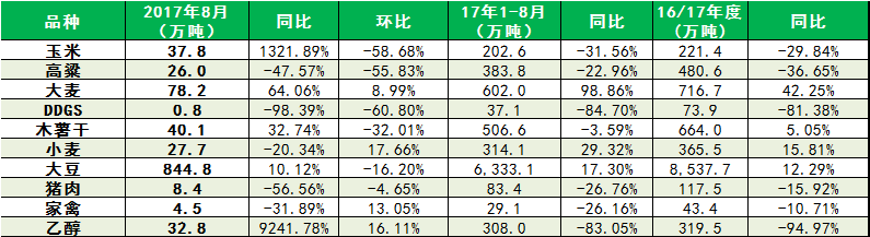 2017年8月中国进口玉米及相关替代品数量