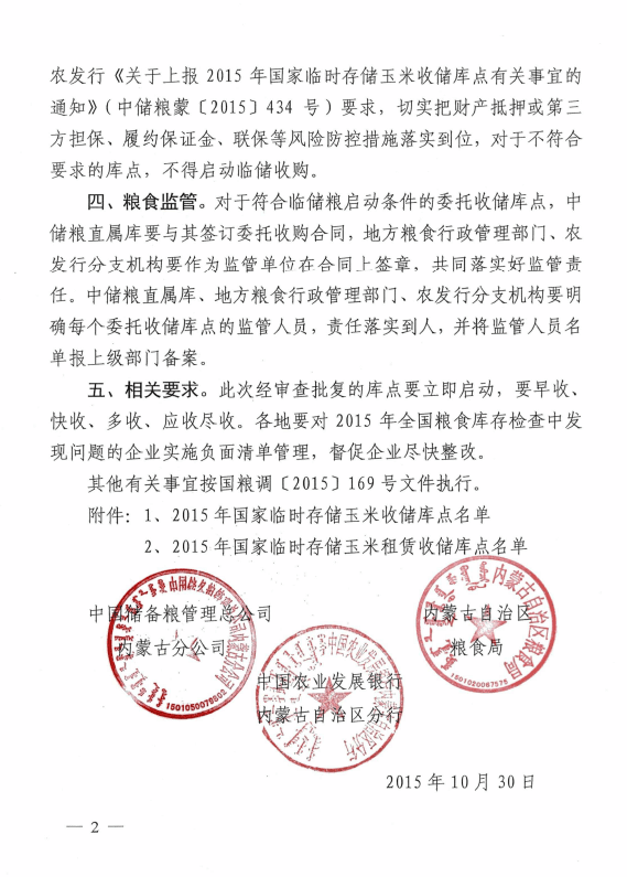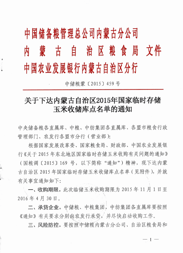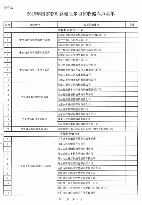 关于下达内蒙古自治区2015年国家临时存储玉米收储库点名单的通知