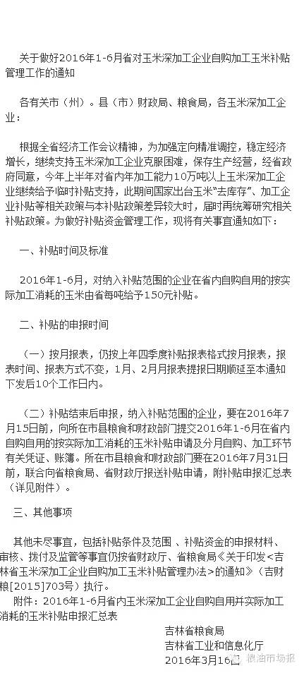 3月17日,吉林省财政厅、省粮食局和省工信厅联合印发了《关于做好2016年1-6月省对玉米深加工企业自购加工玉米补贴管理工作的通知》(吉财粮〔2016〕149号),对纳入补贴范围的企业2016年1-6月份在省内自购自用的玉米,按实际消耗数量,每吨给予150元补贴。此期间国家出台玉米“去库存”、加工企业补贴等相关政策与本补贴政策差异较大时,届时再统筹研究相关补贴政策。补贴条件及范围、补贴资金的申报材料、审核、拨付及监管等事宜仍按省财政厅、省粮食局《关于印发<吉林省玉米深加工企业自购加工玉米补贴管理办法>的通知》(吉财粮[2015]703号)执行。