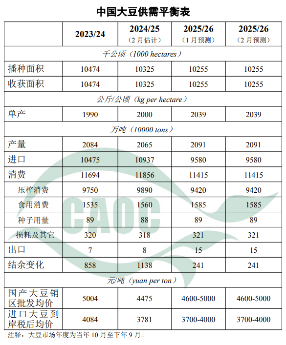 本月对中国大豆供需形势预测与上月保持一致。国内方面,国产大豆市场运行总体平稳,国储收购和拍卖有序推进,基层余粮持续减少,优质豆源供应偏紧。国际方面,巴西大豆产量预估上调,南美大豆丰产格局进一步明朗,全球大豆供应保持宽松。