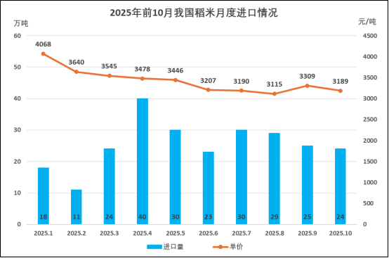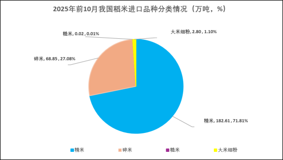 1-10月累计进口糙米0.02万吨,均为泰国长粒糙米进口。累计进口大米细粉2.80万吨。累计进口碎米68.85万吨,同比增36%,占进口总量比例27%;进口单价2783元/吨,同比跌16%。累计进口精米182.61万吨,同比增222%,占进口总量比例72%;进口单价3546元/吨,同比跌24%。从今年进口品种的分类占比来看,稻米总体呈现多元化,精米仍占据主导地位,进口米品种调剂的作用较为明显,然而由于2025年国内市场玉米和小麦供需相对宽松,进口饲料粮源替代的需求显著下滑,尽管总体进口量同比增多,但碎米进口占比不足3成。
