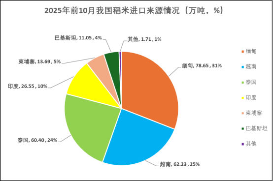自泰国累计进口60.40万吨,同比增31.24万吨,增幅107.17%,占进口总量比例23.75%,下降2.72%。进口单价3892元/吨,同比跌1114元/吨,跌幅22.25%。由于今年前7个月泰国大米出口报价持续高企,普遍高于缅甸、越南、印度、巴基斯坦等东南亚主要竞争对手,因此进口市场份额被挤占。据USDA 11月供需报告预测,2025/26年泰国大米出口750万吨,同比下降1.3%。根据泰国方面近年的统计数据显示,中国一直是泰国大米的重要进口市场,今年以来对华出口呈现强劲的增长态势;近日泰国总理发布消息称,中国将从泰国进口50万吨大米,标志着中国在扩大泰国大米进口方面持续保持积极态度,预计2025年四季度泰国大米进口将维持增长势头,在春节前备货需求的刺激下,年底或2026年一季度或带动一波短暂进口高潮。