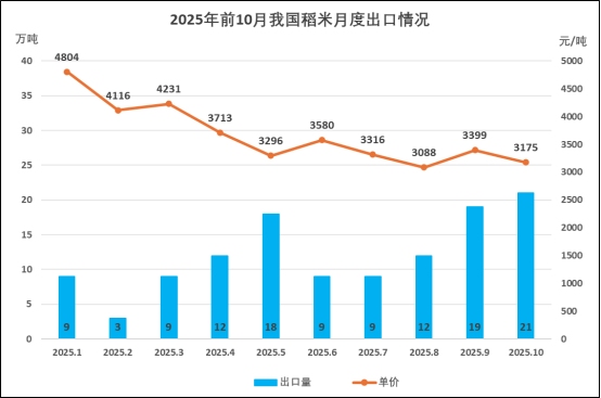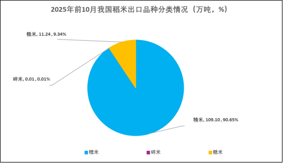 按品种分,10月出口糙米0.75万吨,占出口总量比例3.56%。出口精米20.30万吨,占出口总量比例96.44%。
