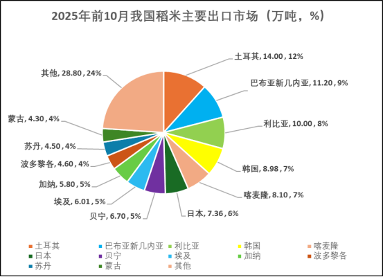 自其他(刚果共和国、科特迪瓦等)累计出口28.80万吨,同比减4.99万吨,降幅14.77%,占出口总量比例23.93%,下降11.89%。我国稻米出口市场结构的优化调整,从依赖少数传统市场转向多元化发展,特别是在非洲、中东等新兴市场的拓展取得了积极成效。