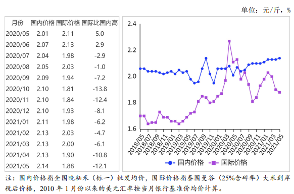 (四)国际大米到岸税后价低于国内,价差继续扩大。5月份,配额内1%关税下泰国大米到岸税后价每斤1.88元,比国内晚籼米批发价每斤低0.26元,价差比上月扩大0.03元;离岸价折人民币每斤1.55元,比国内低0.59元,低27.6%。