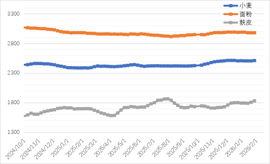 监测显示,截至1月28日,河南省小麦原粮进厂均价为2511元/吨,较上期上涨0.24%;面粉出厂均价为2980元/吨,与上期持平;麸皮出厂价为1831元/吨,上涨1.33%。