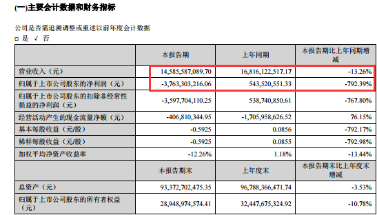 温氏股份4月26日晚间发布一季度报告,公司一季度实现营业收入145.86亿元,同比下降13.26%;一季度实现归属于上市公司股东的净利润为亏损37.63亿元,上年同期为盈利5.43亿元。