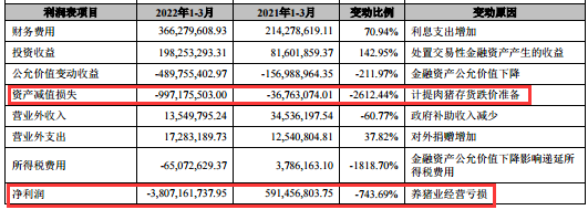 对于一季度的大幅亏损,温氏股份公告称,原因是“养猪业经营亏损”。此外,温氏股份一季度资产减值损失高达9.97亿元,为计提肉猪存货跌价准备。