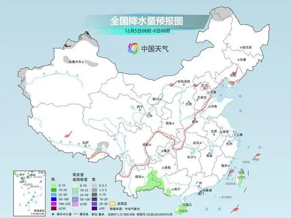 明天,内蒙古东北部、黑龙江西北部、新疆北疆北部和南疆西部山区、西藏东南部等地部分地区有小到中雪或雨夹雪,其中,新疆北疆北部局地有大雪或暴雪;贵州西南部、云南东部、广西西部、海南岛大部、台湾岛东部等地部分地区有小雨。