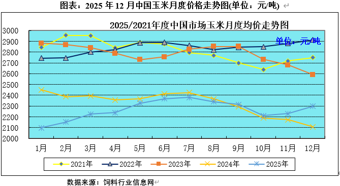 2025年12月国内主产区进口玉米投放加码,市场恐高心理开始显现,基层种植户惜售情绪减弱,售粮节奏同比偏快,粮源消耗速度有所加快,供应压力逐渐减轻,优质粮源的稀缺性持续凸显,下游企业补库节奏有所加快,提振现货价格继续偏强波动,全国现货均价月环比涨幅为2.62%。