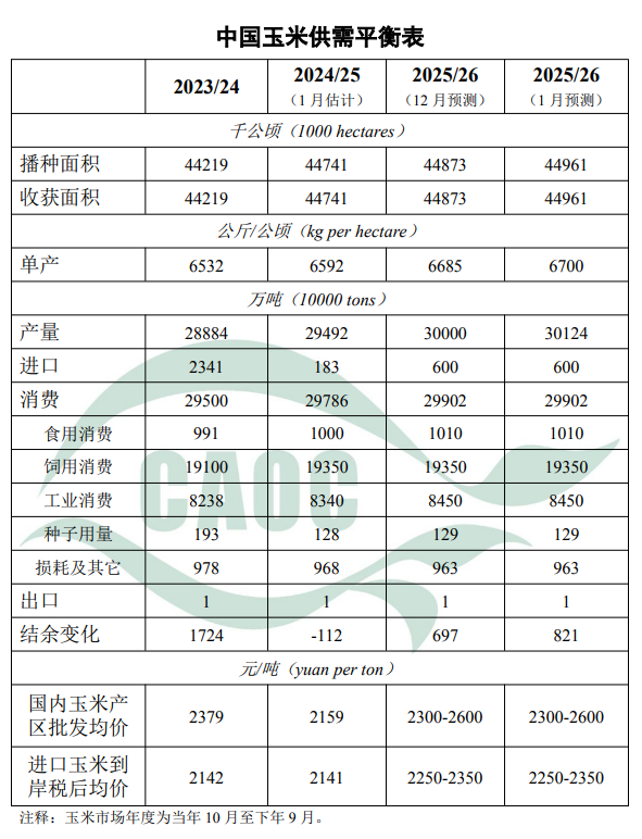 2025/26年度中国玉米生产数据根据国家统计局公告进行调整,播种面积调整为44961千公顷,比上年增0.5%;单位面积产量调整为每公顷6700公斤,比上年增1.6%;总产量调整为30124万吨,比上年增2.1%,再创历史新高。12月下旬开始,东北产区气温下降,利于玉米脱粒。当前仍处于玉米传统售粮高峰期,市场购销活跃,销售进度同比偏快,深加工企业库存同比偏低,存在补库需求,玉米价格底部支撑较强。