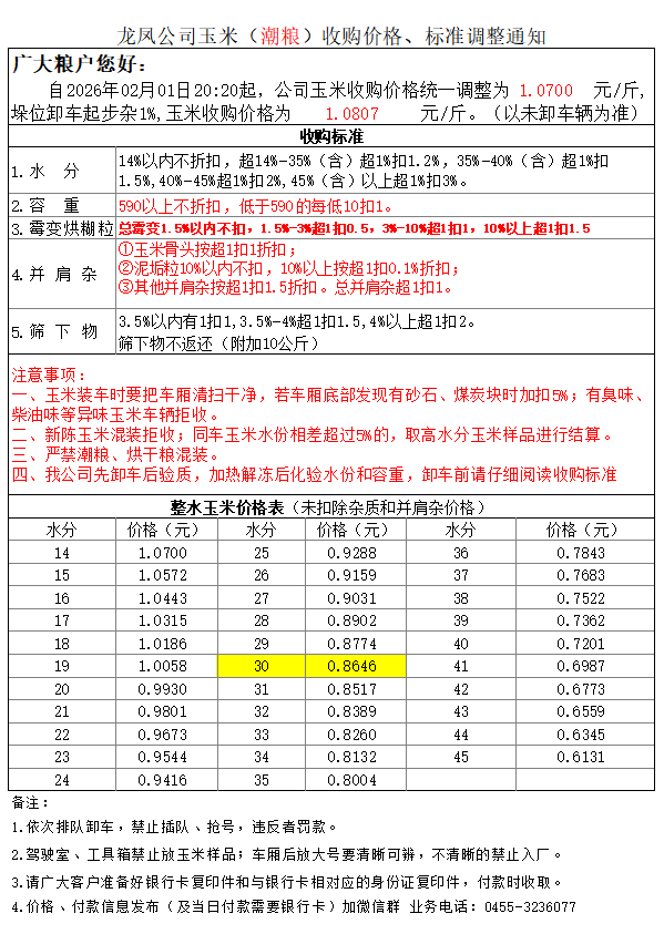 2月2日黑龙江龙凤公司玉米(潮粮)收购价格