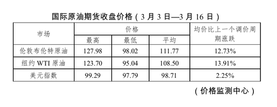 上次调价期初,市场对俄乌冲突导致的原油供应减少产生恐慌,拉动油价暴涨。美国宣布禁止进口俄罗斯原油,部分欧洲国家也提出减少依赖俄罗斯能源的计划。欧佩克坚持小幅增产 ,并不理会欧美主要能源消费国有关提高产量的要求。市场担忧全球原油供应出现较大缺口,恐慌心理拉动油价多次出现超预期上涨,伦敦布伦特、纽约WTI原油期货最高结算价分别涨至每桶128美元、124美元的近14年高点。此后,俄乌会谈有所进展,美国释放出解禁伊朗、委内瑞拉原油出口的消息,投机资金抛售多头头寸,油价从高点显著回落,但平均价格依然大幅高于上个周期。与上个调价周期相比,伦敦布伦特、纽约WTI油价分别大幅上涨12.73%、13.91%。