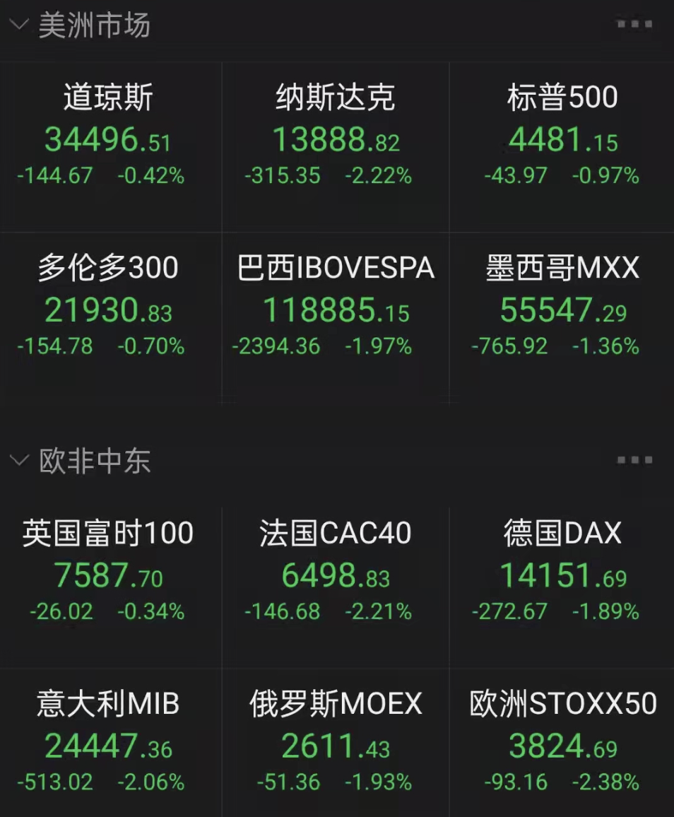 当日晚间,美股三大指数亦遭遇集体下挫,全天低开低走,截至收盘,标普500指数收跌0.97%,道指收跌0.42%,纳指大跌2.22%。