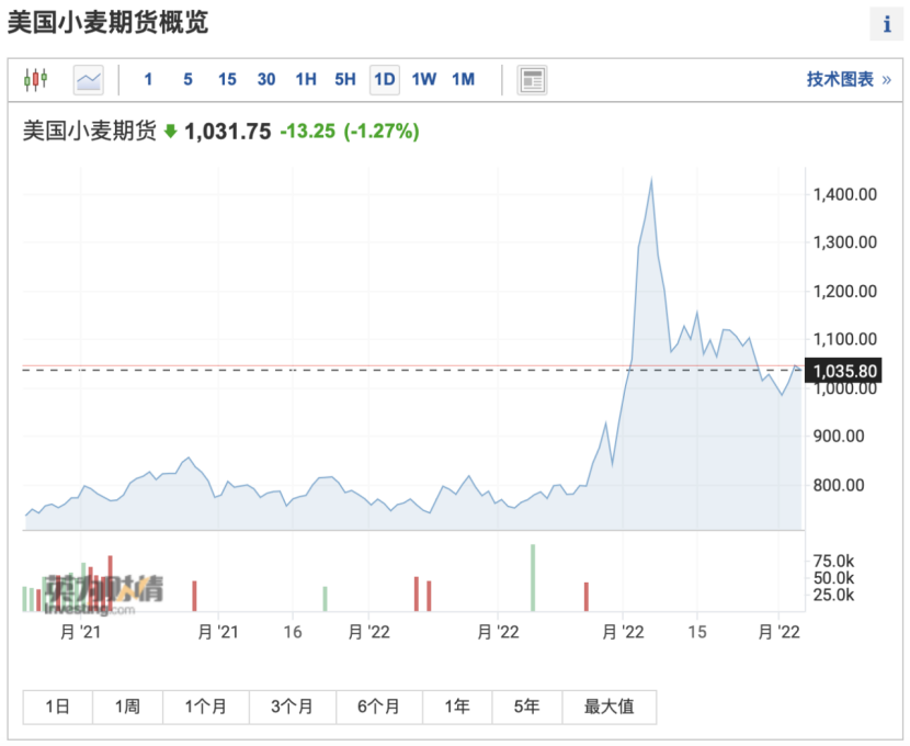 近一段时间以来,俄乌冲突引发市场对于小麦供应的担忧,芝加哥期货交易所(CBOT)的小麦价格上涨明显。过去一个月,CBOT小麦期价上涨约32%;今年以来,CBOT小麦期价的最高涨幅一度接近62%。