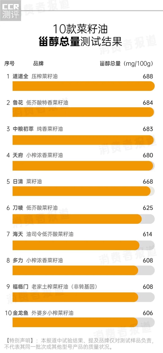 测试结果显示,道道全甾醇总量最高,达到了688mg/100g;鲁花和中粮初萃紧随其后,分别为684mg/100g和683mg/100g。