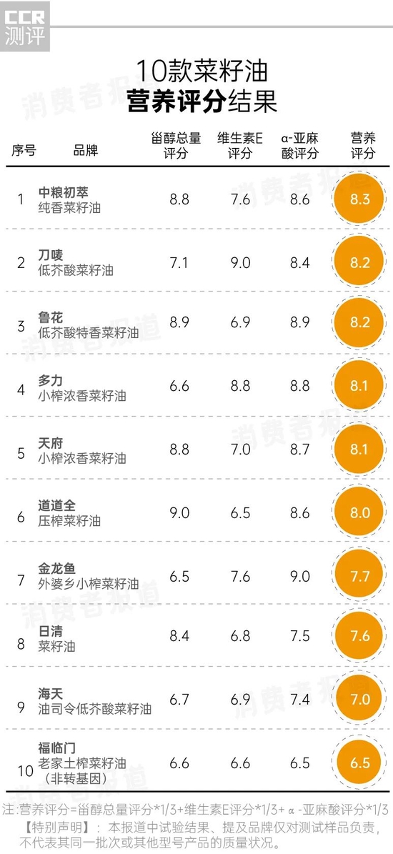 所以,食用菜籽油可以起到平衡脂肪酸摄入比例的作用,那么,10款菜籽油的表现又如何?