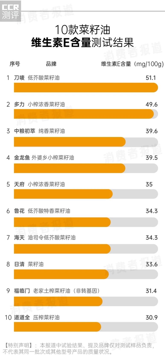 测试结果显示,道道全维生素E含量最低,只有30.9mg/100g;刀唛则最高,达到了51.1mg/100g,多力紧随其后,含量为49.6mg/100g。