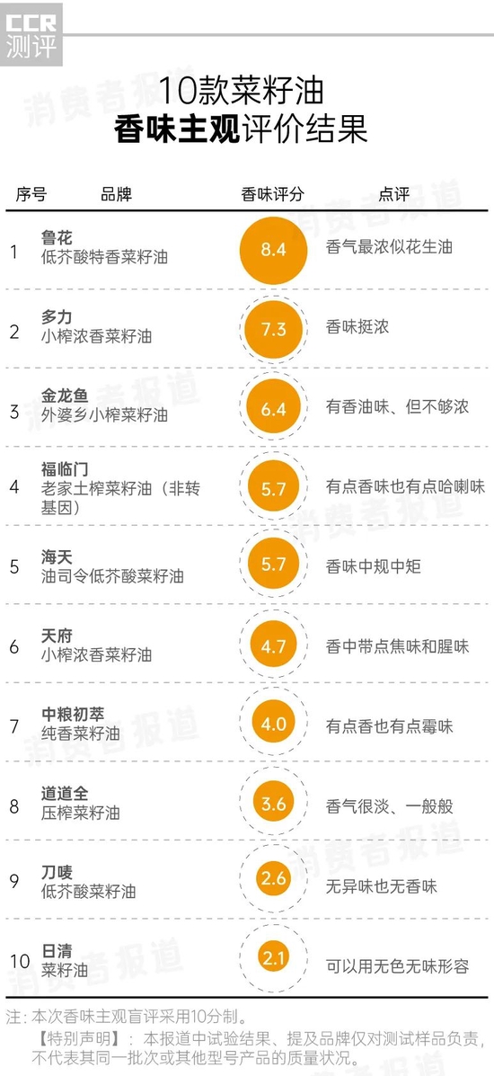 3、香味方面,刀唛低芥酸菜籽油和日清菜籽油评分最低,分别只有2.6和2.1,被志愿者一致吐槽毫无“香味”。