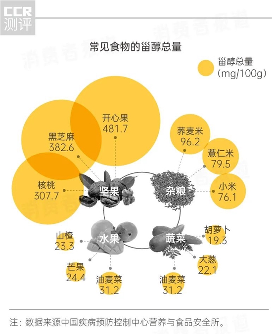 坚果、杂粮、蔬菜和水果等是甾醇含量较为丰富的食物,甾醇含量在23.3mg/100g~481.7mg/100g之间。