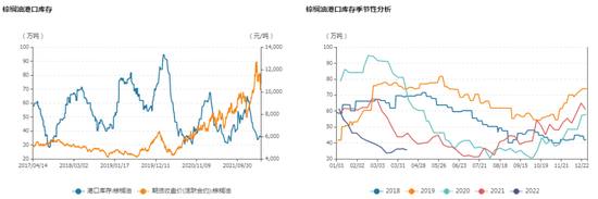 国内由于棕榈油较高的进口价格,进口利润倒挂、加上国内疫情的反复,棕榈油消费偏弱。截至4月14日,我国棕榈油进口成本13019.13元/吨,进口利润-2364元/吨。棕榈油港口库存为35.55万吨,环比减少0.9万吨。从季节性来看,棕榈油港口库存位于历史较低水平。