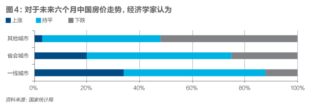 关于房价走势,调查结果显示,对于北上广深等一线城市,54%的经济学家预期未来六个月房价“持平”,比重比上季度降低9个百分点;34%预期“上涨”,提高8个百分点;12%预期“下跌”,略升1个百分点。对于省会城市,55%的经济学家预期房价“持平”,比重比上季度提高2个百分点;20%预期“上涨”,提高4个百分点;25%预期“下跌”,降低6个百分点。对于其他城市,52%的经济学家预期房价“下跌”,比重比上季度降低12个百分点;45%预期“持平”,提高14个百分点;3%预期“上涨”,降低2个百分点(见图4)。