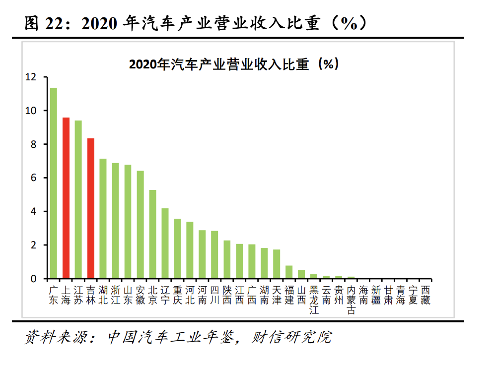 从投资分项看,制造业投资受疫情影响或更大,基建成为投资发力首选项。制造业对供应链稳定的要求明显强于基建和房地产,加之上海、吉林等地均是汽车制造大省(见图22),预计本轮疫情中制造业投资尤其是汽车投资需求遭受的冲击将明显强于房地产和基建。在房地产市场预期尚未完全扭转和国内房地产市场中长期步入存量时代的共同影响下,房地产投资全年增速低于去年已成定局,预计基建投资将成为稳增长发力、对冲疫情影响的首选项。