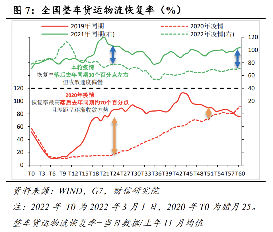 从受冲击程度看,货物运输恢复率同比增减一定程度上可以剔除季节性因素,我们用该指标来粗略衡量疫情对物流运输的冲击程度。本轮疫情期间,整车货物运输恢复率较去年同期低20-40个百分点,同比降幅均值约为27.7%,为2020年疫情爆发期间最高降幅的4成左右(见图7)。从冲击持续性看,今年3月下旬后,整车货物运输恢复率同比降幅窄幅波动,截止4月末仍未见明显收敛态势。而2020年疫情爆发后,整车货物运输恢复率快速向2019年常态水平回归,物流运输恢复相对较快(见图7)。本轮疫情物流运输收缩后恢复较慢的主要原因,在于疫情多地散发和变种病毒的高传染性拉长了国内疫情清零周期。