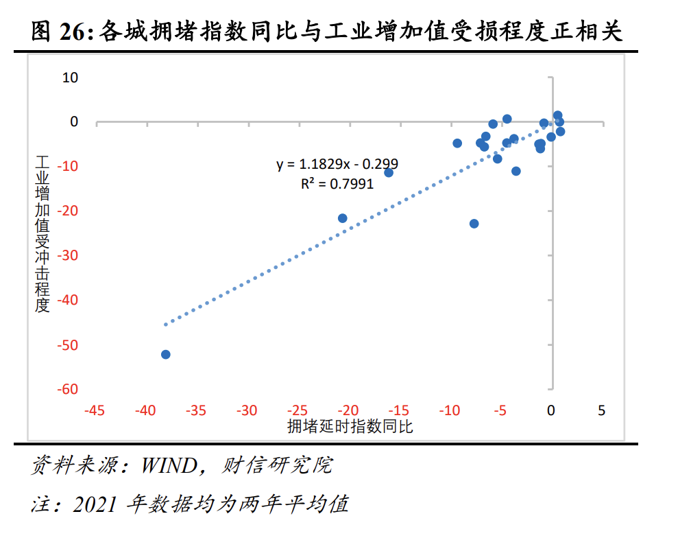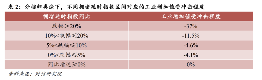 2、根据历史数据估算拥堵延迟指数下降与工业增加值受冲击程度的数量关系。我们发现拥堵延时指数同比增速与工业增加值受冲击程度存在明显的正相关关系(见图26),回归方程为0.799。为此我们通过回归函数和分档归类两种方法,确定不同拥堵延时指数同比增速对应的工业增加值受冲击程度,具体分档结果见表2。