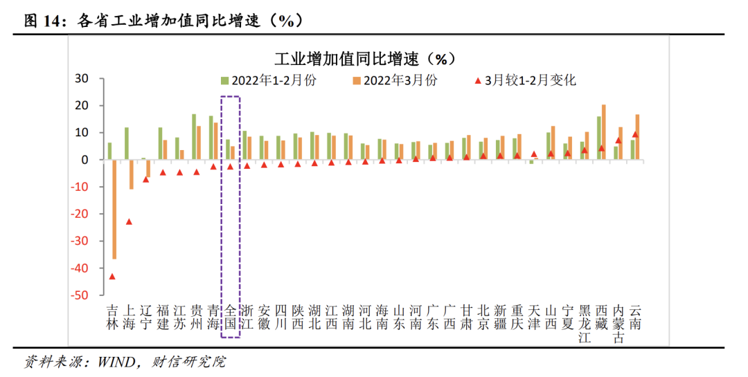 分地区看,吉林、上海等疫情严重省份是工业生产的主要拖累。3月份全国规模以上工业增加值同比增长5%,较1-2月份回落2.5个百分点,其中吉林、上海两省环比降幅分别高达43和22.8个百分点,为工业增加值的主要拖累。同时31个省份中,有20个省份工业增加值增速环比回落,本轮疫情波及省份较多(见图14)。预计4月上海对工业生产的拖累作用将有所增强,4月份工业生产面临的回落压力较大。