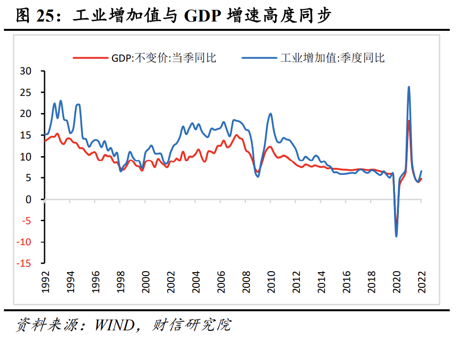 方法二(城市法):根据前几轮疫情影响和“拥堵延迟指数同比增速”估算主要城市月度GDP受损程度,再以各城GDP全国比重加权估算疫情对经济的冲击程度。由于我国整体仍处于工业化进程中,国内工业增加值和GDP具有高度同步性(见图25),因此工业增加值增速变动一定程度上可以代表GDP增速变化。基于上述原因,本部分的测算思路如下: