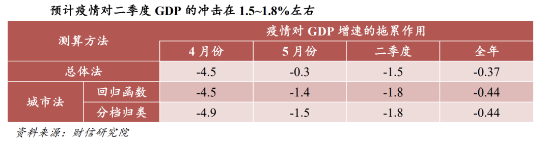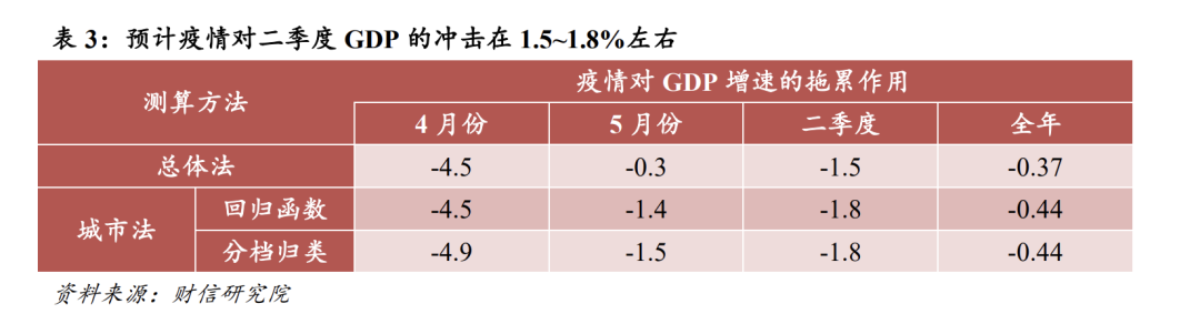 三、影响评估:预计疫情对二季度GDP的冲击在1.5-1.8%左右,约拖累全年GDP增速0.4个百分点