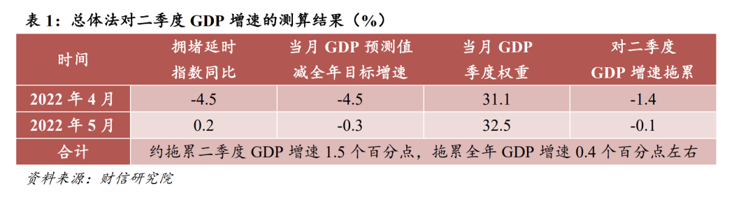 方法一(总体法):用百城拥堵延时指数同比对GDP同比进行拟合,回归方程高达0.90,具有较好的拟合效果。我们将4月份百城拥堵延时指数同比带入回归方程,并假设5月份百城拥堵指数恢复至2020年5月份水平(2020年4月百城拥堵指数均值与今年4月份相当,且当时也处于疫后恢复期),6月份疫情冲击基本消失。测算结果显示,今年4月和5月GDP同比增速比5.5%的目标增速分别低4.5和0.3个百分点,再以工业增加值占比代替月度GDP比重,加权结果显示疫情对二季度GDP的拖累幅度在1.5个百分点左右,拖累全年GDP增速约0.4个百分点左右(见表1)。
