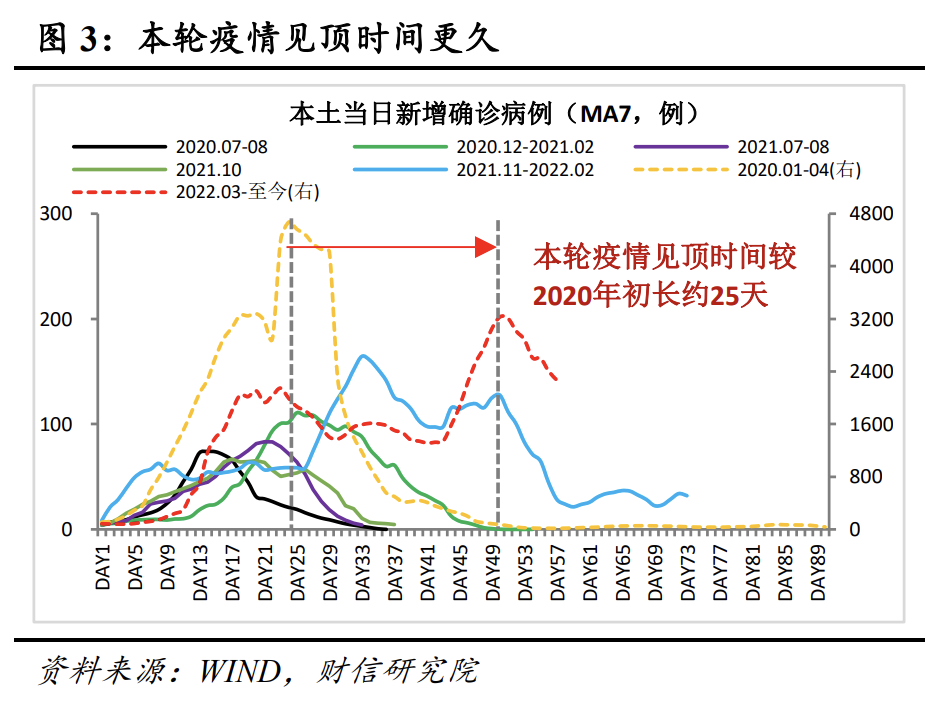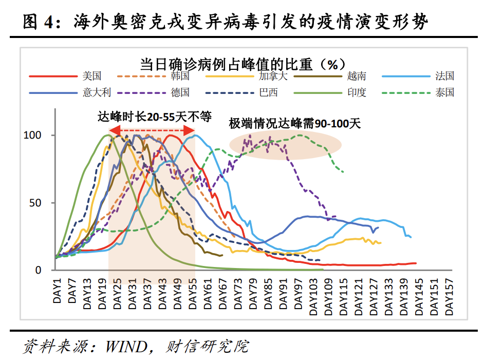 从持续时长看,目前基本可以确定本轮疫情见顶时间约为50天左右(见图3),较2020年初的疫情约长25天,即见顶时间长度接近翻番。本轮疫情持续时间偏长,主源于本轮疫情主流毒株为奥密克戎变异病毒,其传染率更高、隐匿性更强,导致疫情控制难度明显加大。根据海外疫情的传播经验,奥密克戎变异病毒主导的疫情见顶时间也基本在20-55天不等,极限情况下甚至达到90天以上(见图4)。