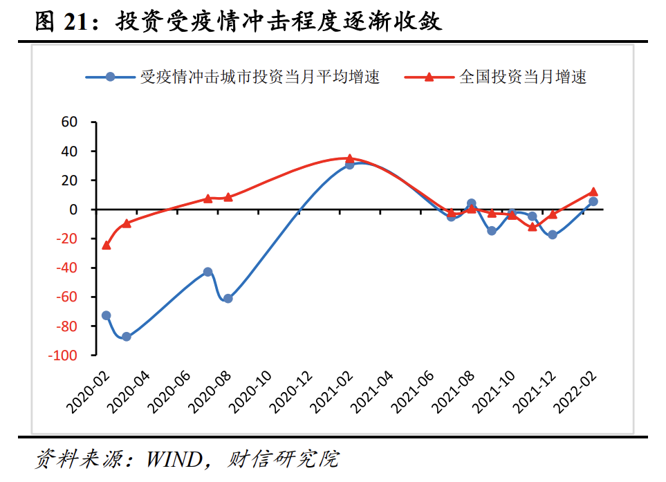 与消费相比,投资受疫情冲击程度相对可控。一是与接触性服务业直接受到冲击不同,固定资产投资虽然也需要大量的劳动力,但人员相对固定、流动范围有限,加之投资项目地点多数远离城市中心,疫情对固定资产投资的冲击将明显小于消费,且主要体现为供应链冲击。二是投资受冲击程度随着国内防疫政策精准性提升趋于减弱。复盘历次国内疫情爆发期间的固定资产投资表现,我们发现受疫情冲击城市当月固定资产投资平均增速与全国固定资产投资增速的差距趋于收敛(见图21)。主要原因在于国内防疫政策愈发灵活和精准,保生产、保供应链稳定工作也不断推进,固定资产投资受到的人力、资源等生产要素冲击趋于减弱。