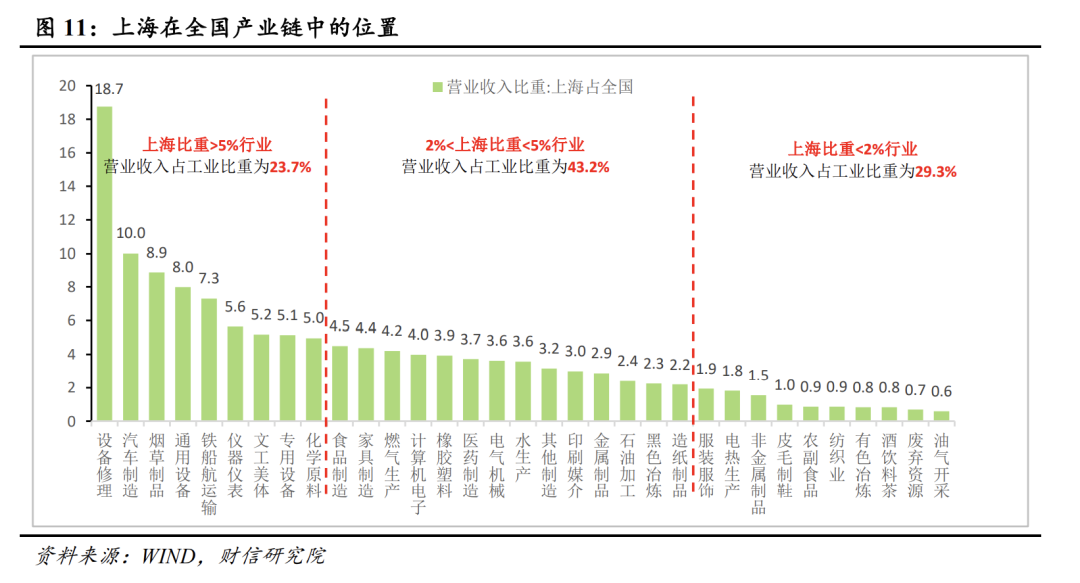作为全国最大的中心城市之一,上海是国内制造业大省和货物贸易中心,因此上海防疫封控升级不可避免会地对供应链形成冲击。我们用2021年上海工业细分行业营业收入占全国比重,来衡量上海在国内产业链中的位置。数据显示,上海营业收入占全国比重超过5%的行业包括设备修理、汽车制造、烟草制品、通用设备、交通运输设备、仪器仪表、专用设备等行业,这部分行业营业收入占全部工业的比重为23.7%,且多数属于中游装备制造业(见图11)。中游装备制造业处于整个产业链的中间位置,向上对应上游行业的需求,向下为下游行业提供中间产品,中游装备制造业受到冲击波及范围将相对较广。上海全面封控时间过久或导致相关中游产品生产和供应不足,对全国整体供应链正常运转的影响不容小视。