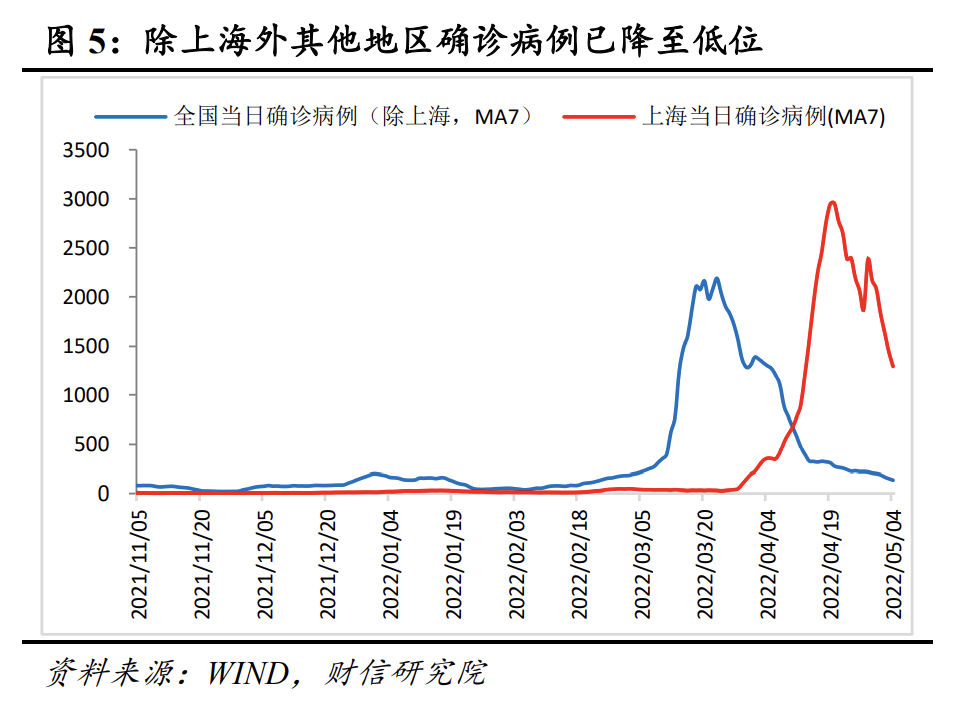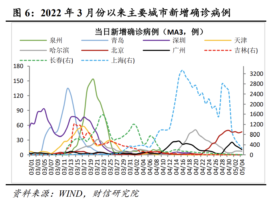 本轮疫情形势虽然依旧严峻,但总体趋势已出现好转迹象。如目前全国当日确诊病例和无症状感染者数量均已出现拐点(见图1),特别是除上海外的其他地区确诊病例数量已降至偏低水平(见图5),上海感染人数亦已拐头向下。此外,国内疫情难免仍有反弹或反复,但4月中下旬出现反弹的广州、哈尔滨疫情基本都在较快时间内得到控制(见图6),近日北京疫情有所抬头也已迅速采取有效措施。因此,预计5月份疫情大概率总体趋于缓和。