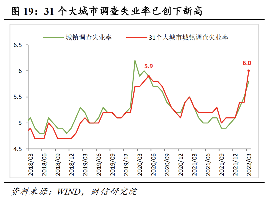 三是服务业企业经营困难和部分工业企业停工停产,导致居民收入、就业面临冲击,将减弱居民消费能力,且其对消费的影响往往会更持久一些。如3月份国内经济景气指数制造业PMI已降至50%的荣枯线下方,同时全国城镇调查失业率和31个大城市城镇调查失业率均大幅攀升,后者甚至创新有统计数据以来新高,超过2020年疫情期间水平(见图19),表明居民就业压力已较为突出,对居民收入和消费当期和未来的影响已偏大。