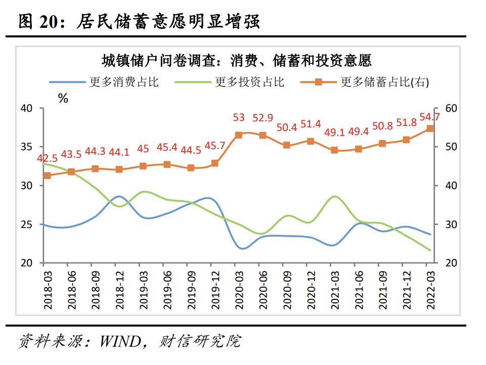 四是疫情还会影响居民收入预期,增强居民储蓄意愿。疫情导致企业利润受损、居民就业增收困难,会加大居民对未来收入和就业不确定性的担忧,从而增加预防性储蓄需求,进一步制约消费恢复。如根据央行的调查数据,2022年一季度城镇居民消费、储蓄和投资意愿调查中,倾向于“更多储蓄”的居民占比达54.7%,比上季增加2.9个百分点(见图20),创下2002年以来历史新高,甚至已超过2020年疫情最严重阶段。