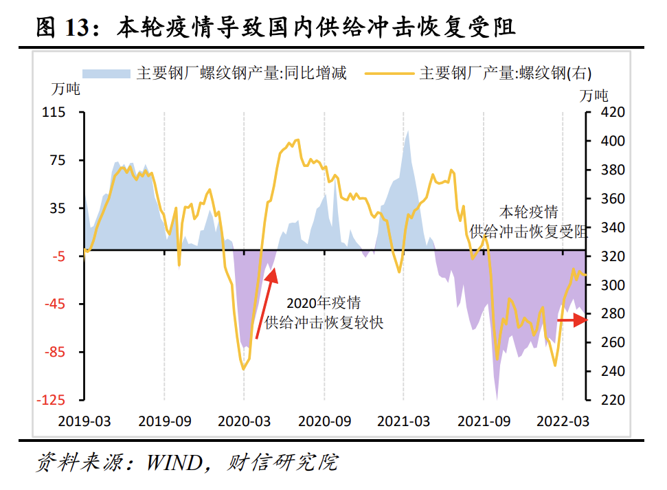 从冲击深度和持续性看,与2020年疫情不同,本轮疫情爆发于国内供给政策纠偏的关键时点,疫情扩散前国内供给冲击呈持续改善迹象,但疫情反弹导致国内供给修复速度放缓。如3月份以来,螺纹钢周产量同比降幅持续维持在50万吨左右,虽然降幅较2020年疫情和去年下半年大幅收窄,但回升斜率明显走平,供给冲击修复进程受阻(见图13)。