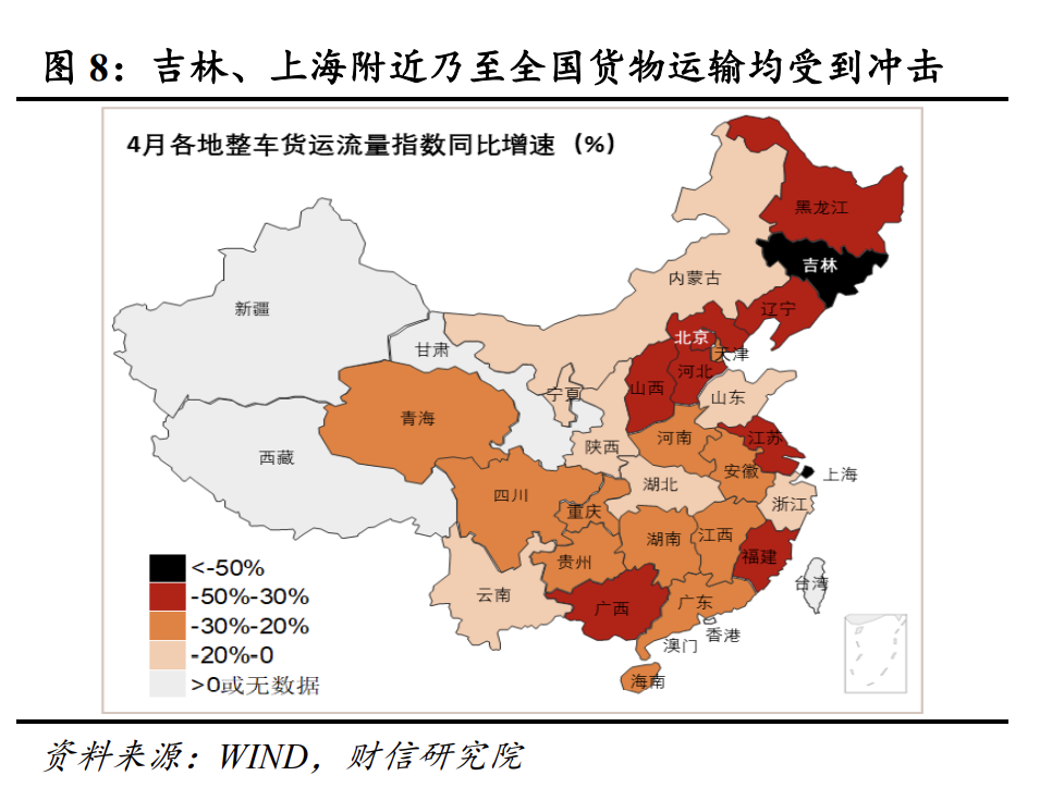 3月下旬以来,全国整车货物运输恢复率(与前一年旺季相比)呈下降趋势,由3月上半月的约91%降至4月份的65%左右(见图7),显示出疫情对国内物流运输产生了明显冲击。