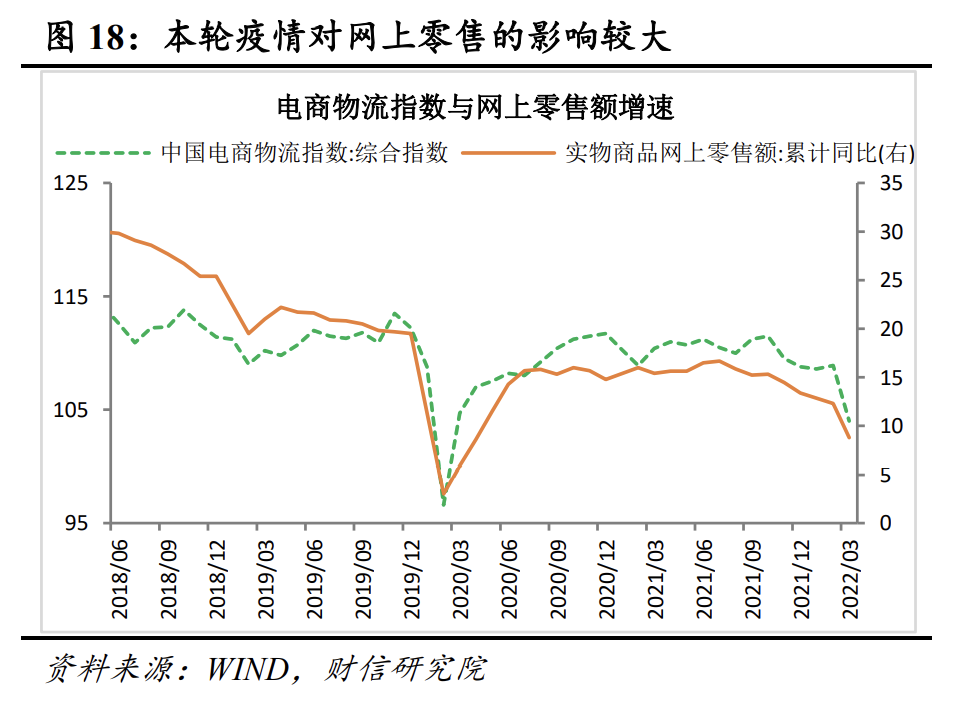 二是本轮疫情集中在快递物流占比较高的城市爆发,导致全国物流效率下降,线上消费面临较大拖累和冲击,这与以往疫情反弹线上消费可一定程度替代线下消费出现明显不同。如2022年3月份以来,国内累计确诊病例超过1000例和500例的省份,规模以上快递业务量占全国的比重分别高达40.5%、71.6%(见图17),导致全国快递物流效率明显下降,线上电商销售受到较大冲击。3月份全国电商物流综合指数较上月大幅回落约5个百分点,降至除2020年初疫情外的最低水平,与之相对应,国内实物商品网上零售额亦大幅回落(见图18)。