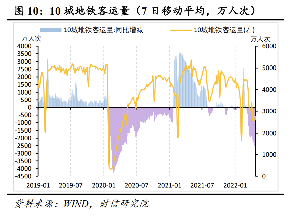 受疫情冲击影响,3月5日以来,百城拥堵延时指数(MA7)同比增速由正转负,随后降幅呈扩大态势,但4月10日以来,同比降幅呈收窄态势,表明全国范围内的人员返岗情况正在边际好转(见图9)。但从地铁客运量看,包括上海、北京、广州等城市的10城地铁客运量仍处于下行通道中,其日均规模与去年同期的差距持续超过2000万人次,为2020年疫情最高降幅的50%左右。若参照2020年经验,上海等受疫情冲击城市人员返岗完全恢复仍需时日(见图10)。