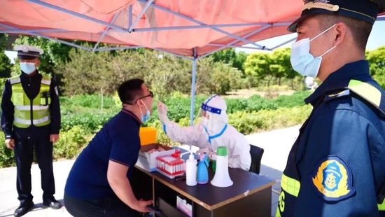 货车司机正在服务区做核酸检测。河北省交通运输厅供图