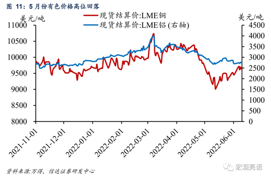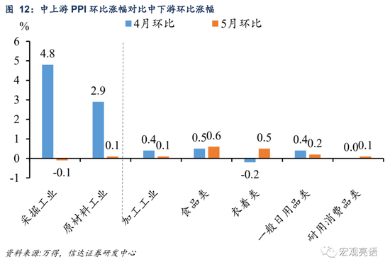 国内需求偏弱,大宗商品价格多数下降。PPI采掘工业环比下降0.1%,上月为上涨2%,原材料工业环比0.1%,上月为1.4%。随着各地安全有序释放先进煤炭产能,多措并举保障煤炭供应,煤炭开采和洗选业价格由上涨2.5%转为下降1.1%,煤炭加工价格上涨0.7%,涨幅回落8.6个百分点。国内经济偏弱运行,加上海外有色金属价格高位回落,5月有色金属冶炼和压延加工业价格下降1.3%。原油产业链是本期PPI的支撑项,国际原油价格震荡上行,带动国内相关行业价格上涨。其中石油和天然气开采业价格上涨1.3%,石油煤炭及其他燃料加工业价格上涨0.9%,化学纤维制造业价格上涨0.8%,化学原料和化学制品制造业价格上涨0.6%。