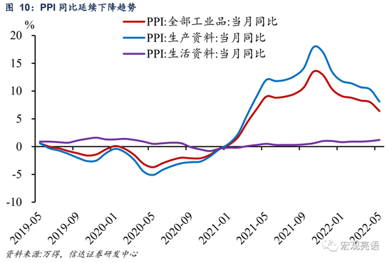 PPI同比回落幅度较大。从同比看,PPI上涨6.4%,涨幅比上月回落1.6个百分点。其中,生产资料价格上涨8.1%,涨幅回落2.2个百分点;生活资料价格上涨1.2%,涨幅扩大0.2个百分点。环比看,PPI上涨0.1%,涨幅比上月回落0.5个百分点。其中,生产资料价格上涨0.1%,涨幅回落0.7个百分点;生活资料价格上涨0.3%,涨幅扩大0.1个百分点。