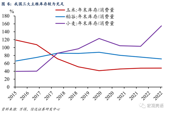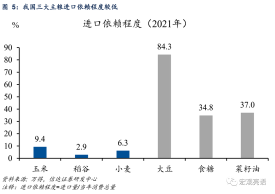 我国主粮对外依赖程度较低,且储备充足,预计国际粮食危机对我国的影响有限。从进口的依赖程度来看,我国稻谷、小麦和玉米进口占国内总消费的比重较低,基本可以实现自给自足;三个主粮的储备也较为充足。需要注意的是,我国有部分农产品的进口依赖度较高,比如大豆的进口依赖度超过了80%,食糖、菜籽油的进口依赖度也处于较高水平,这些农作物对于国际粮食价格的变化会更为敏感。