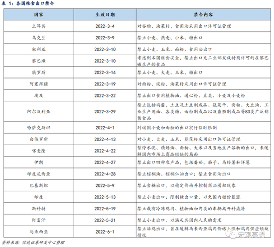 全球粮食危机来源于极端天气、俄乌冲突、出口禁令和成本推升四个因素。一是拉尼娜现象引发的旱涝极端天气使得美国、巴西等全球主要的粮食出口国粮食产量下滑。二是由于俄乌冲突的持续,两国粮食的生产和出口受到了严重的影响。三是3月以来有20多个国家先后出台了粮食出口禁令,导致国际粮食供给格局愈发紧张。四是全球范围的能源价格飙升推升粮食生产成本。